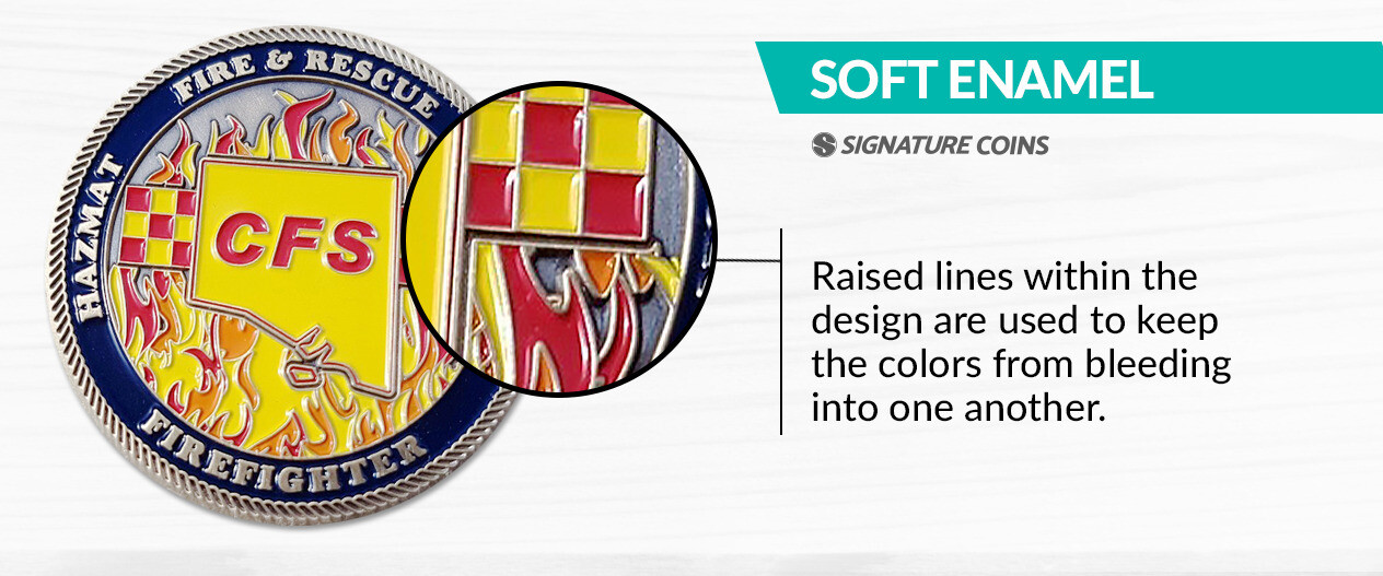 With soft enamel, what you feel when you run your finger over the coin are the raised metal lines of the design which keep the colors in their designated sections. Hard enamel coins do not feel as smooth as a coin coated with epoxy, but because the enamel comes right up to the top of the metal lines, they feel smoother than the soft enamel coins.