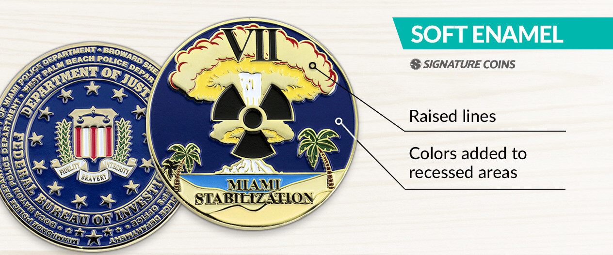 Hard enamel has a strong footing in the lapel pin game, but it hasn’t been adopted as strongly by challenge coins. If the differences that hard enamel can create in your challenge coins appeals to you, request it when placing your order and start the process of turning the tides. If nothing else, you’re sure to get a very unique challenge coin out of the experience.