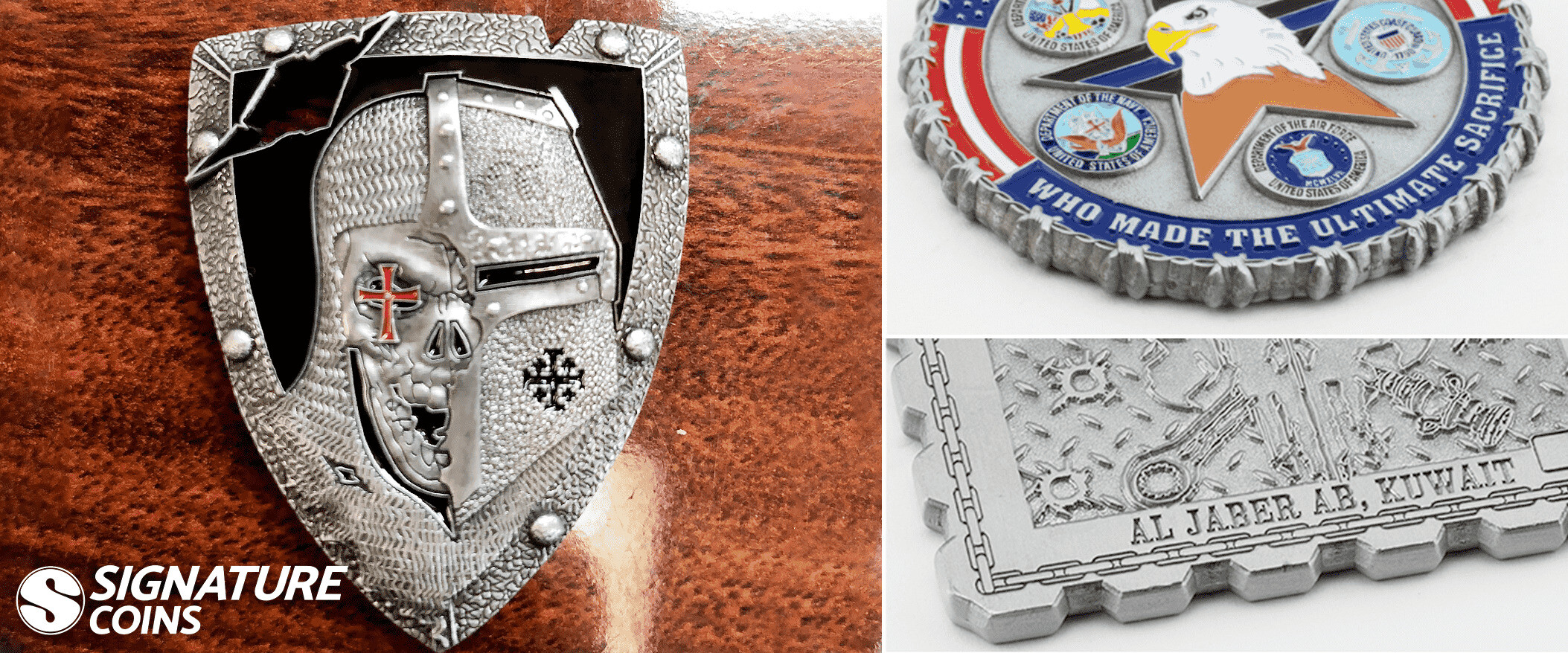 For example, this custom shape coin has a textured edge with metal studs designed to look like authentic armor rivets.