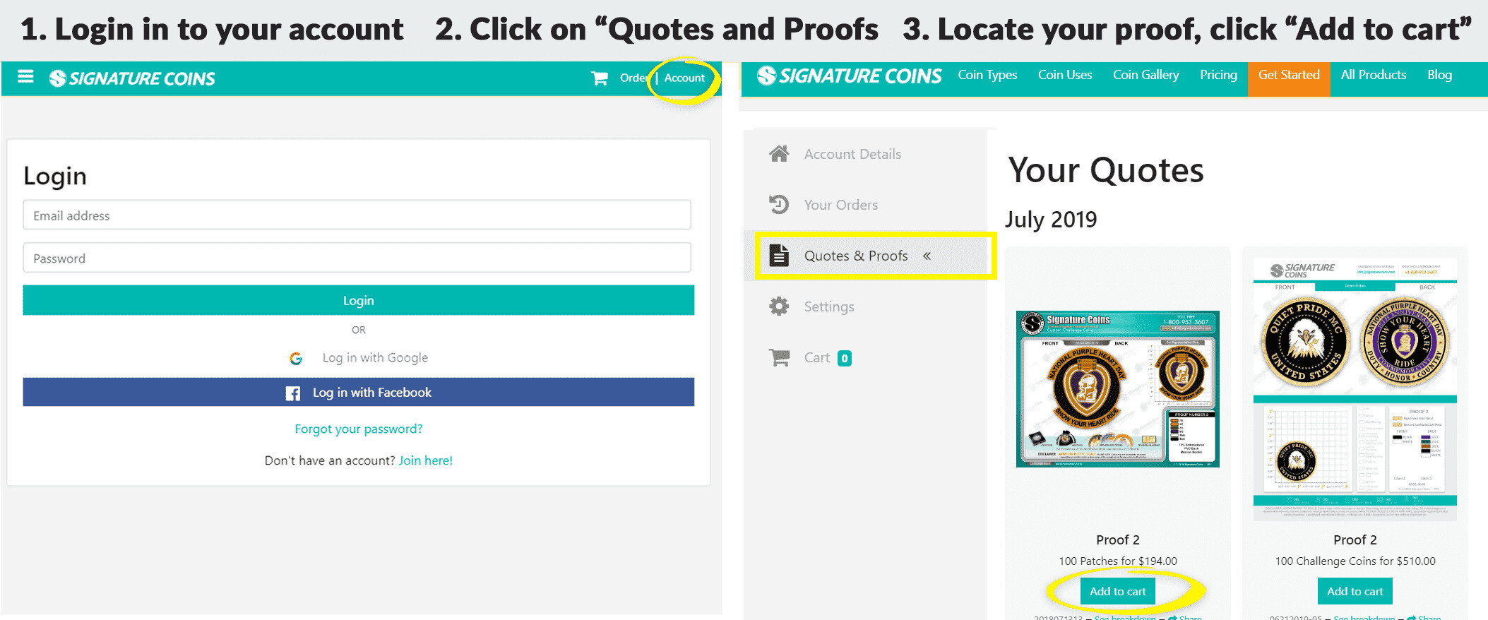 2. After logging in click “Quotes & Proofs” on the left side of the page.