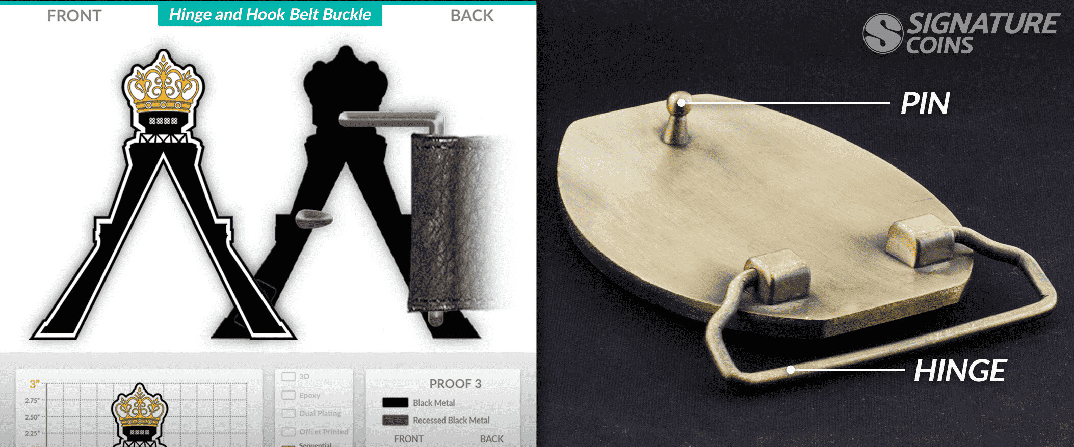Hinge and hook belt buckles are used with any type of belt that has prong holes on the strap. The front is custom molded with any kind of artwork imaginable, while the back has only a hinge to loop the belt through and a hook, or pin, to put through the prong holes on the belt strap.