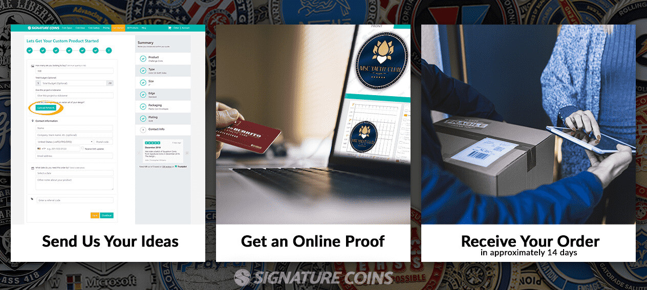 After the custom coin design (Proof) is approved and ordered, the project goes directly into production, and depending on the design, it can take around 2-5 weeks to manufacture the products!