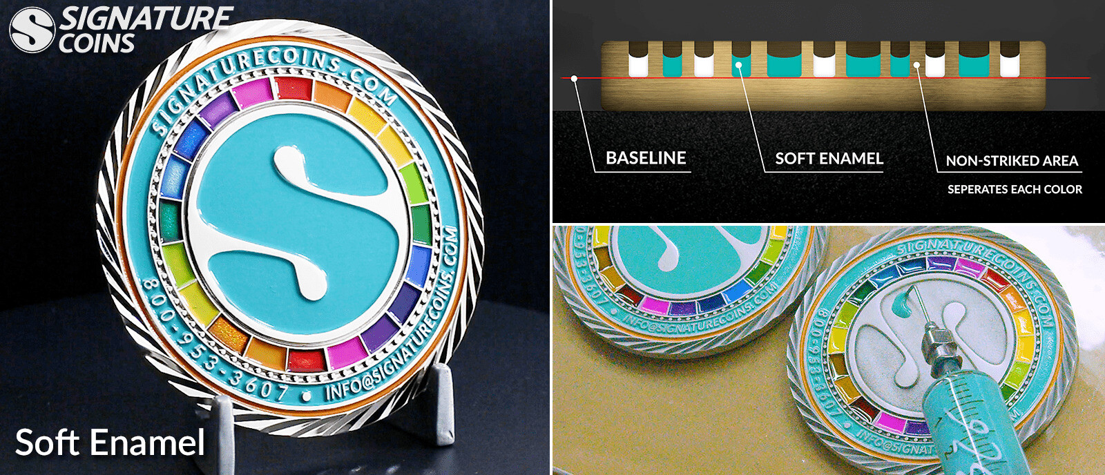 After a custom coin is electroplated in your choice of metal plating, enamel paint is added to the recessed areas of your custom coin. The raised metal lines within the design are used to keep the colors from bleeding into one another. Once all the colors are added to these recessed areas, the coins are heat treated to get the paint to dry quickly and to strengthen it against chipping or other wear and tear.