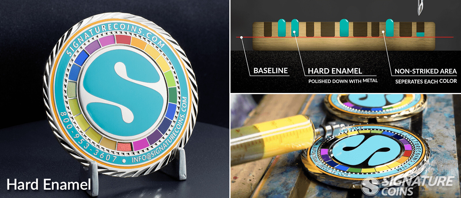 Just like soft enamel, enamel paint is added to the recessed areas of the custom coin, but unlike with soft enamel, the enamel paint is added until it reaches the top of the metal lines. Each color is heat treated before applying the next color. Metal plating occurs after the color filling, so when the coins enter the polishing process, the final result is a smooth flat surface.