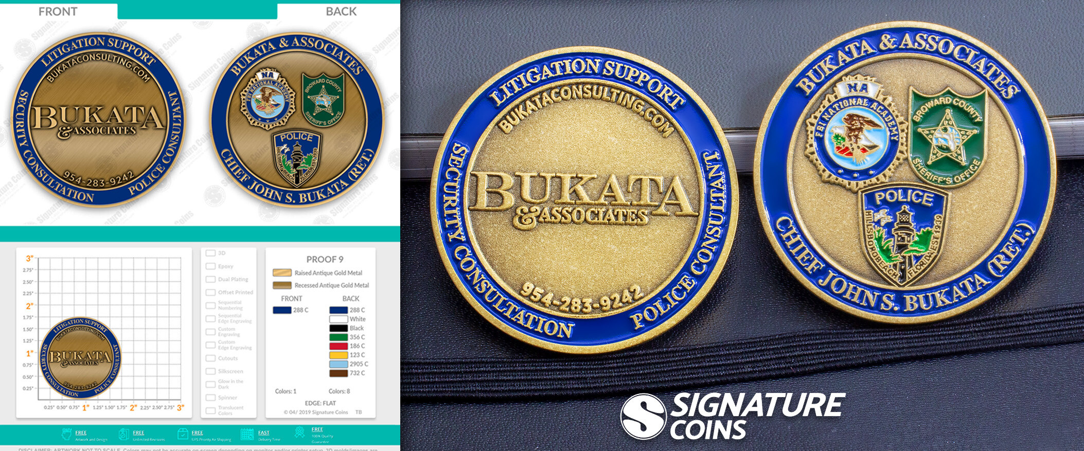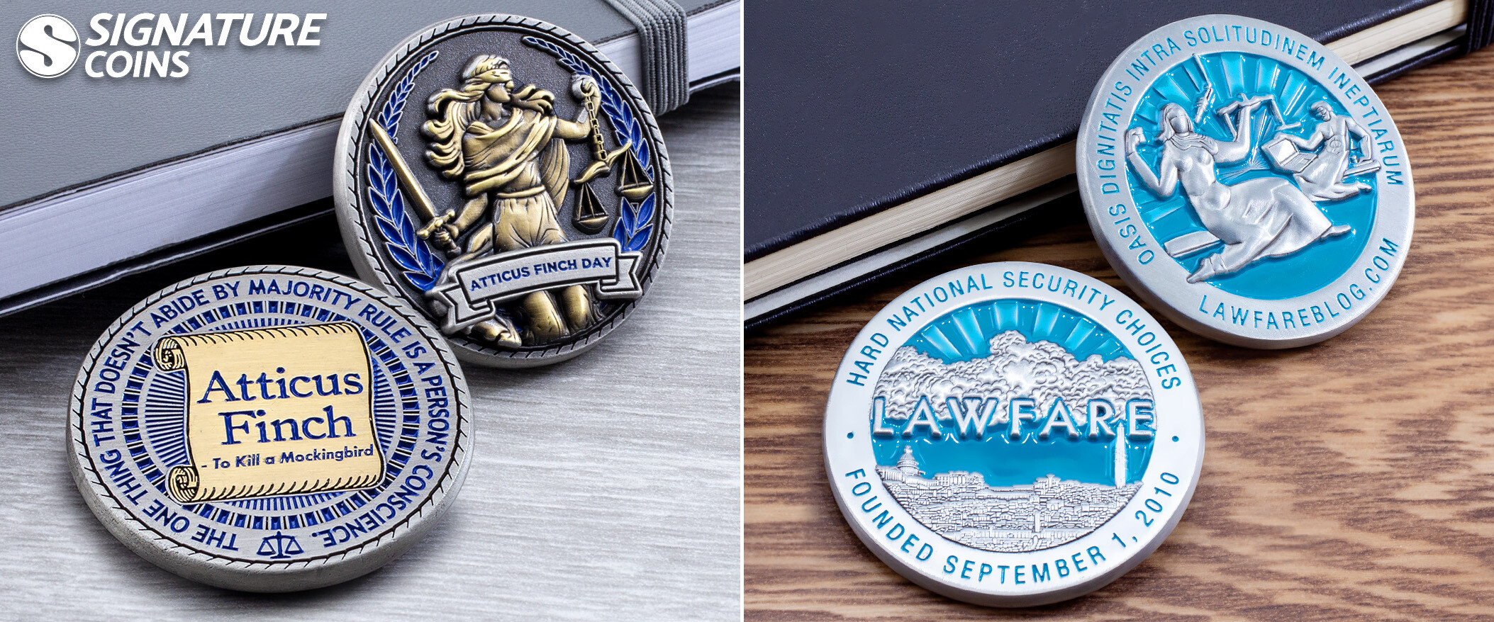 Recently, while looking through a collection of samples here in the office, we came across a group of challenge coins from an industry even we were surprised to see so many different orders from. Even as challenge coins continue to spread throughout law enforcement, law firms aren’t the first places that come to mind when thinking about challenge coin orders. And yet, we managed to find enough coins to create a blog about some of the similarities and differences among these particular types of coins.