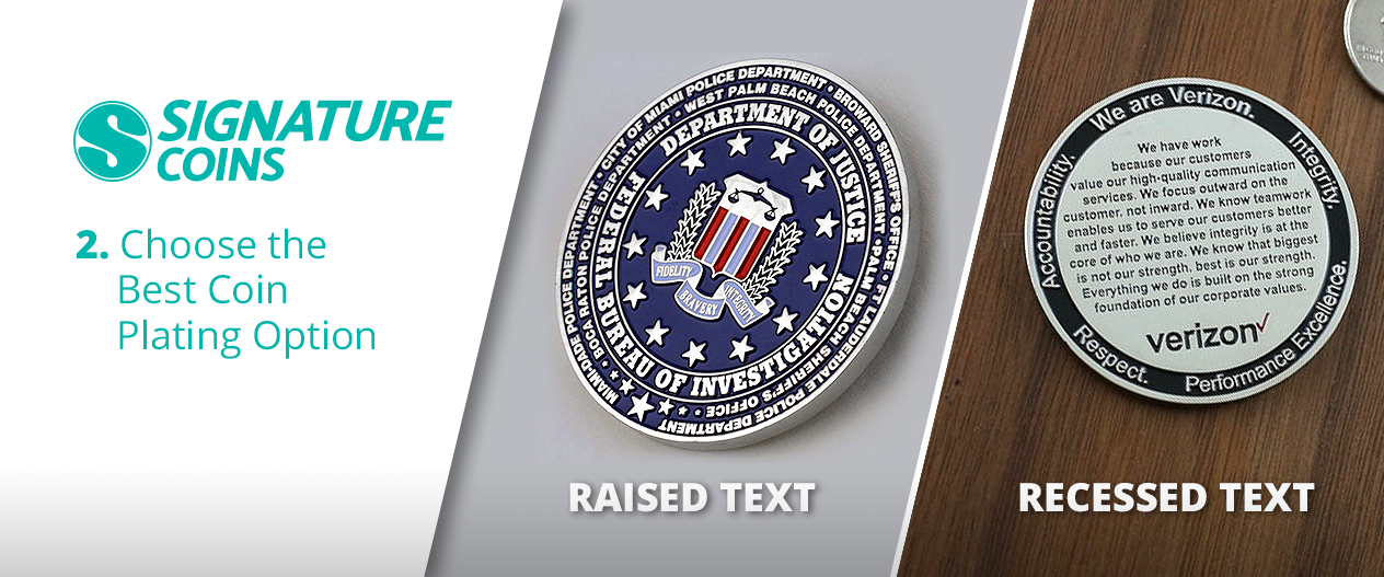 The Verizon coin on the right has the opposite approach. The lettering is recessed, meaning they are pressed into the metal, and each letter is colorfilled with black enamel paint. The sharp contrast makes it much easier to read. For coins with black metal or nickel plating, a better color to add to text would be a bright blue or red. Choosing colors for text all depends on the design.