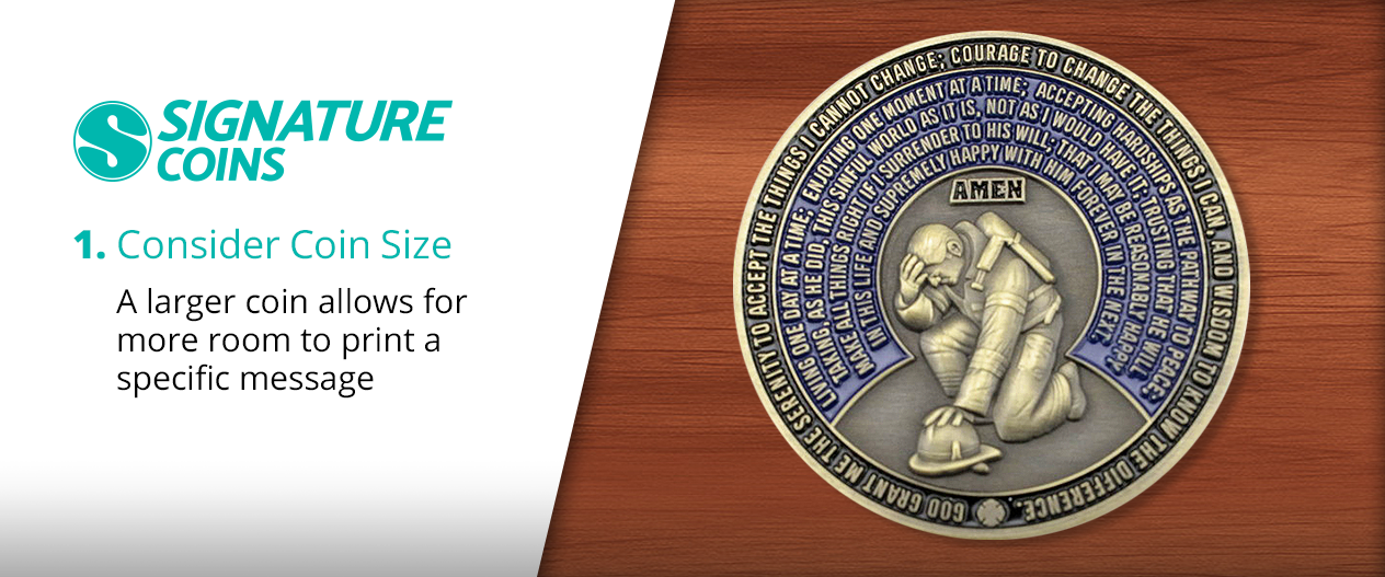 For text-heavy challenge coins, going bigger is definitely better. A larger coin allows for more room to print a specific message, and it goes without saying that large text is easier to read than small text. As a coin gets smaller, it becomes harder to fit phrases on the same line within the constrained space. This can be fixed by making the font smaller but then the words become harder to read.