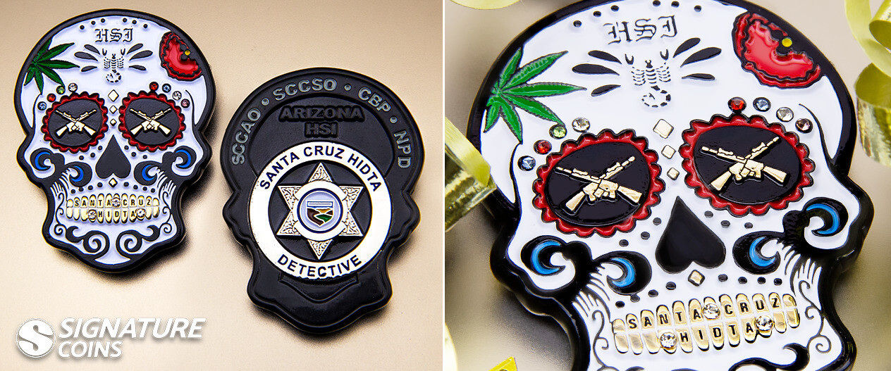 This is one of our favorite examples of 3D design combined with translucent colorfills. It’s not easy to add color to 3D artwork because of the way 3D coins have multiple raised and recessed levels with sloping curves. Our team carefully planned out the design of the skull so that we could include the American flag colors, and the result is incredible.