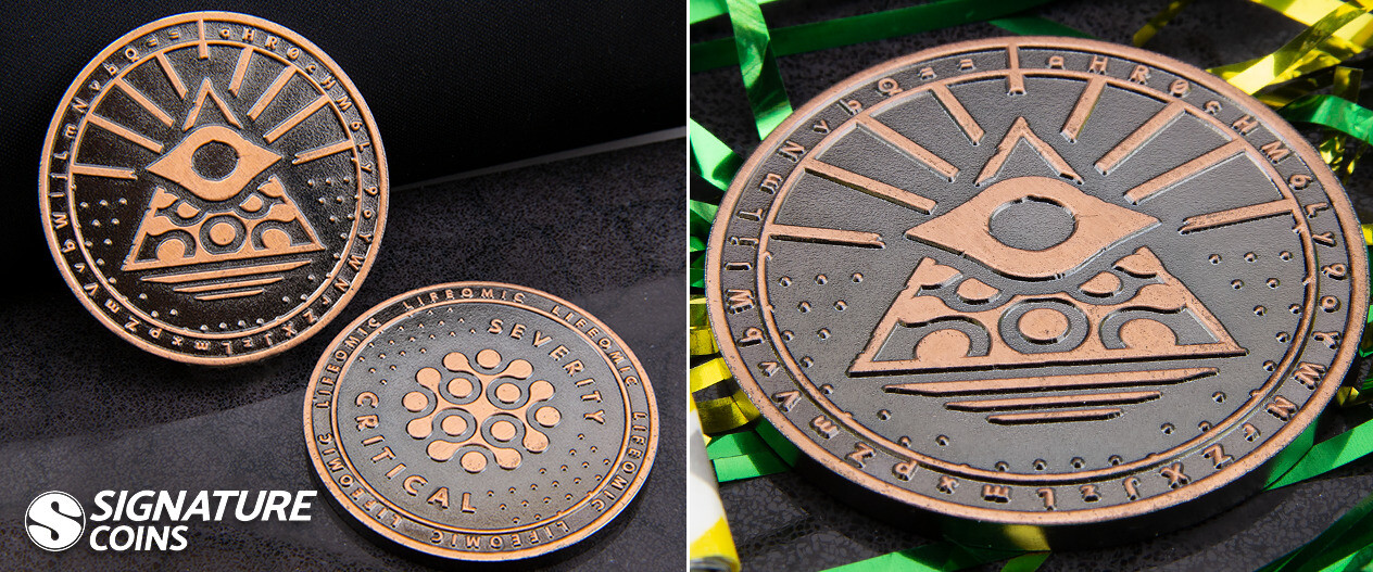 To kick things off, we have a dual plated coin created by LifeOmic. Copper and black nickel are far less common plating options than the variations of gold and silver, giving this coin a unique style that we don’t see very often. The stippling pattern also changes the way the coins feel by adding a sense of texture to the artwork.