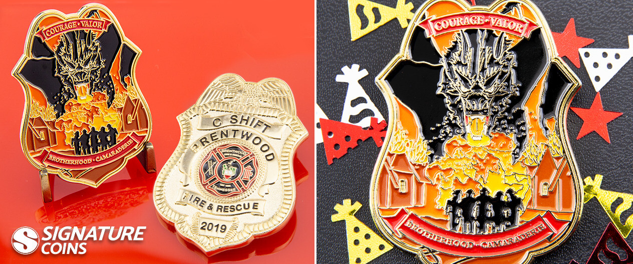 We’ve made all kinds of amazing firefighter coins over the years, and this is one of our favorites. The badge shape is a common theme we see in first responder coins, but the small team of firefighters facing a fire breathing dragon is remarkable.