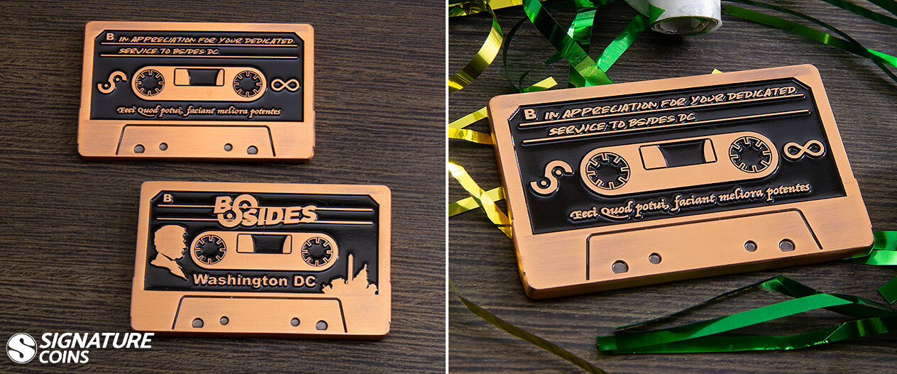 Shape is a powerful tool when creating a custom coin. If you want a badge coin, a gauntlet coin, or even a sugar skull coin, we can make it happen. However, sometimes choosing a simple shape is the best way to convey a message. Cassette tapes have long since gone out of style, but anyone born before the turn of the century will feel a familiar tug of nostalgia as soon as they lay eyes on one of these.
