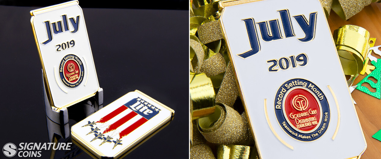 What better way to celebrate the Fourth of July than with a record-setting month in sales and a set of custom employee recognition challenge coins? Goldring Gulf Distributing designed these coins to look like a familiar brand of beer, using high polish gold plating and old glory red and blue for the text, flag and Blue Angels.