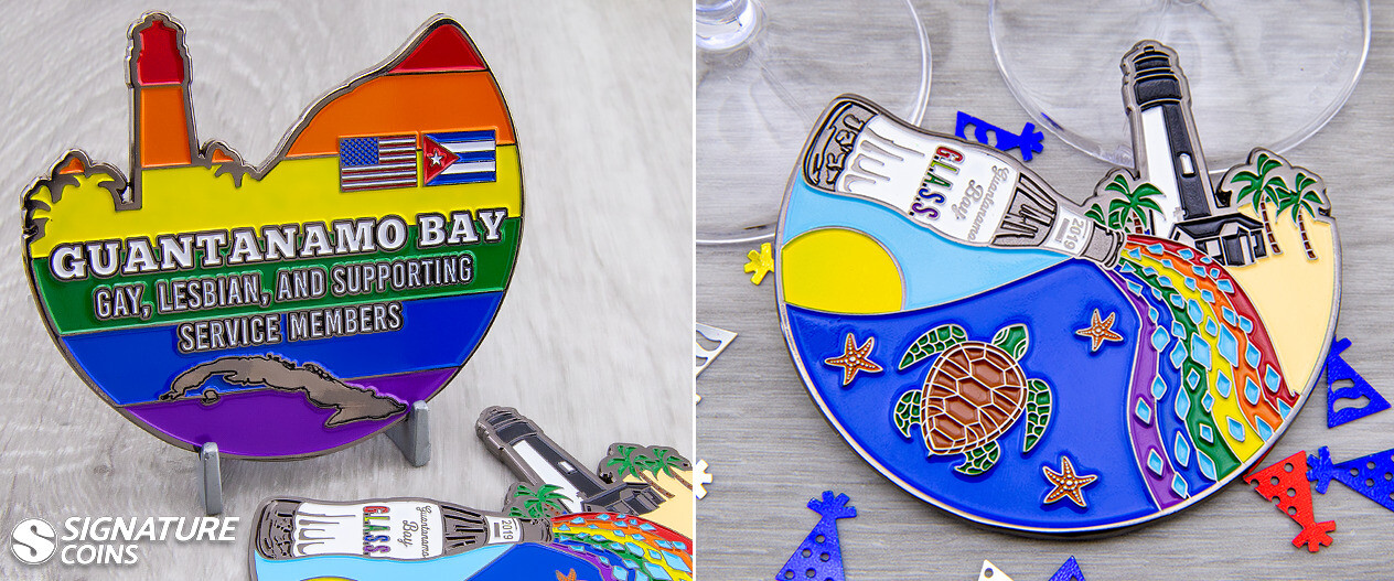 The only way we could have squeezed more color into this coin is if we used iridescent plating instead of black nickel. As it happens, soft enamel was all we needed to create this spectacular design. We love the custom shape and vivid artwork, but the most notable part of the design is the way the black nickel and bright enamel colors feed off each other, creating striking contrast in the design. It just goes to show that you don’t need high polish gold or silver to make a striking challenge coin.