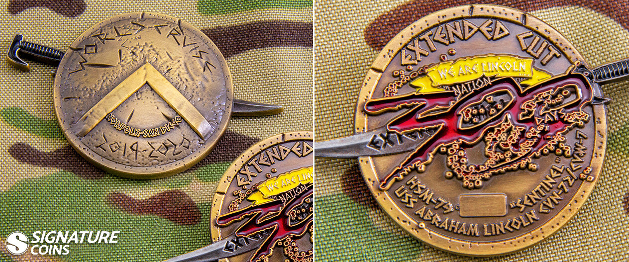 One of the best ways to make a fun and memorable challenge coin is to include references to pop culture in the design. These coins reference the movie 300, using translucent red enamel for the logo, as well as a 3D design to capture the realistic shape of a Spartan shield and sword.
