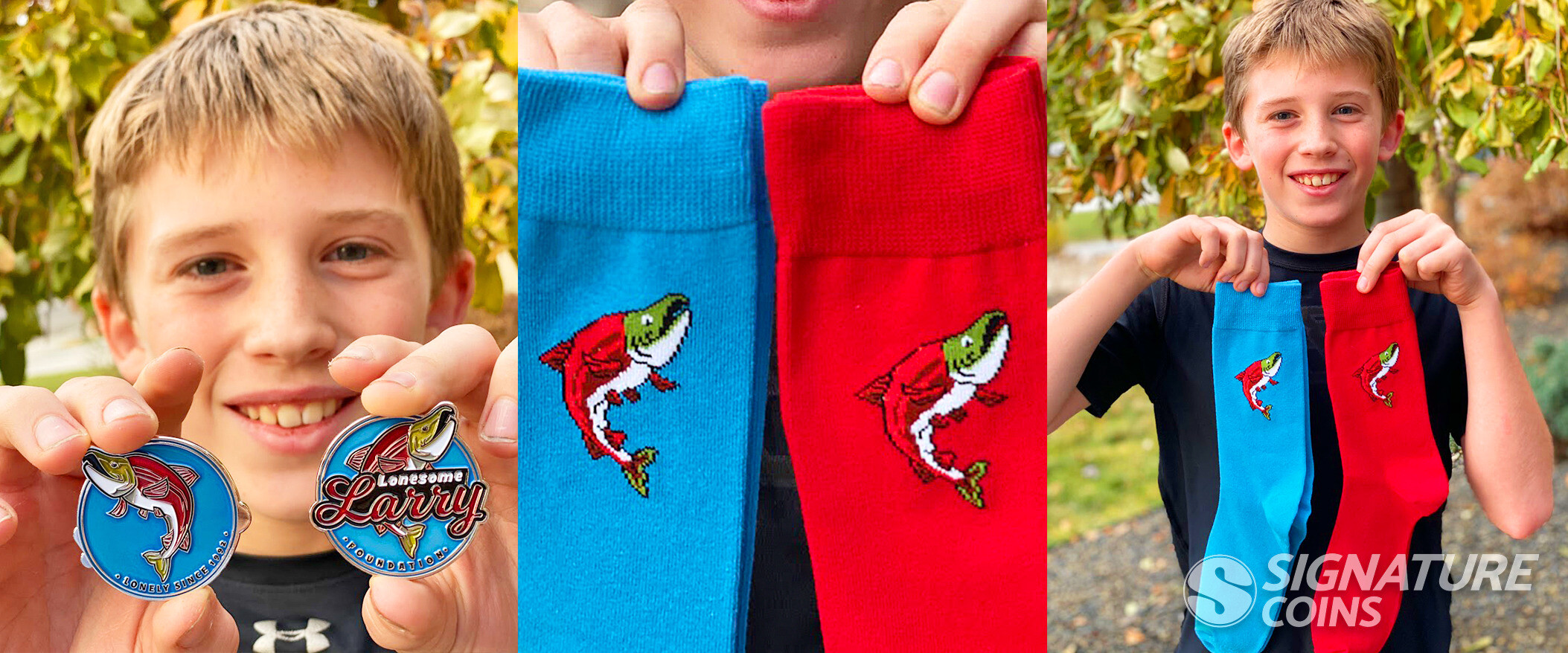 If you want to learn more about Topher and his family, the history of the Sockeye salmon, or if you want to get involved, check out their new Lonesome Larry Project website. You can show your support by picking up a custom challenge coin, a bottle opener, or even a pair of Sockeye socks!