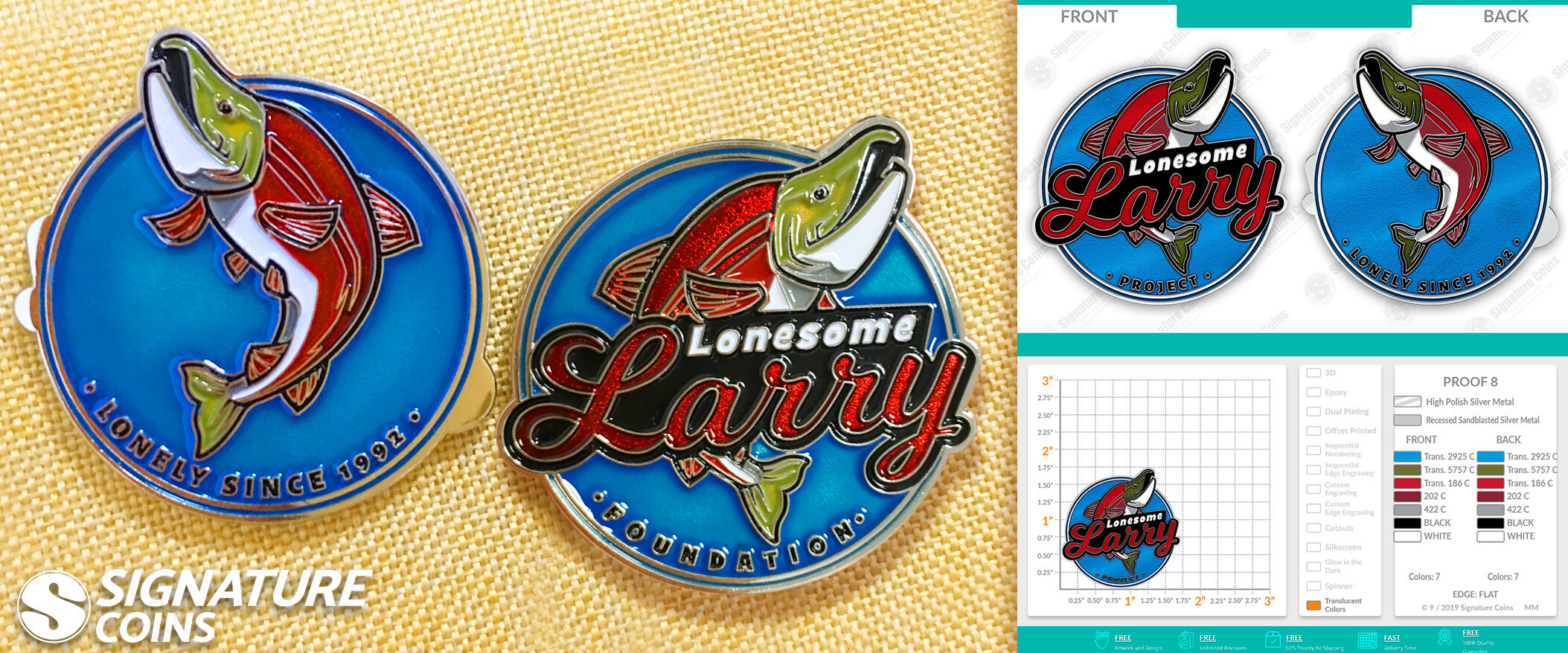 Here at Signature Coins, we were honored to help create the custom coins and bottle openers featuring the Lonesome Larry Project’s logo. Our artists used translucent colors to give the logo a special shimmer that creates a unique, watery effect.