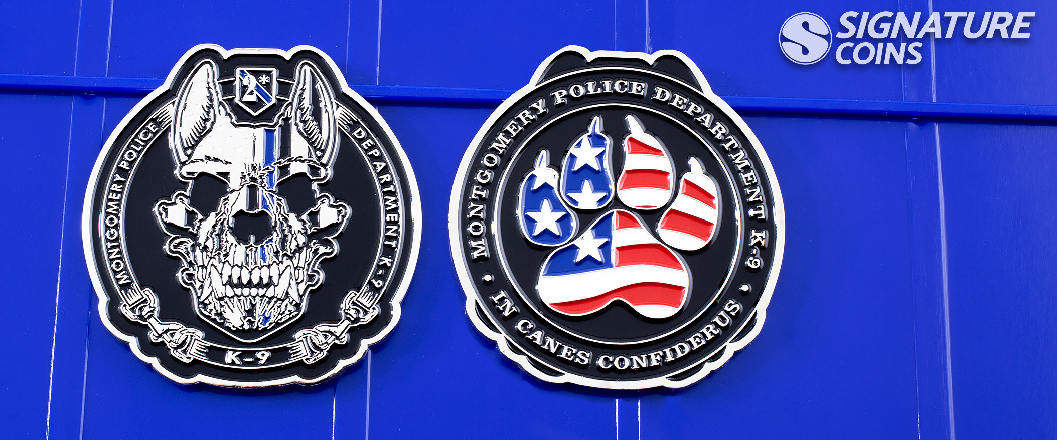 These K-9 unit challenge coins made for the Montgomery Police department have a menacing look and unique shape thanks to the sharp teeth, pointed ears, and dog collar edge in the artwork. Instead of using the thin blue line as a backdrop to the design, the client thought it would be awesome to include it as a stripe along the dog skull, reminiscent of war paint.