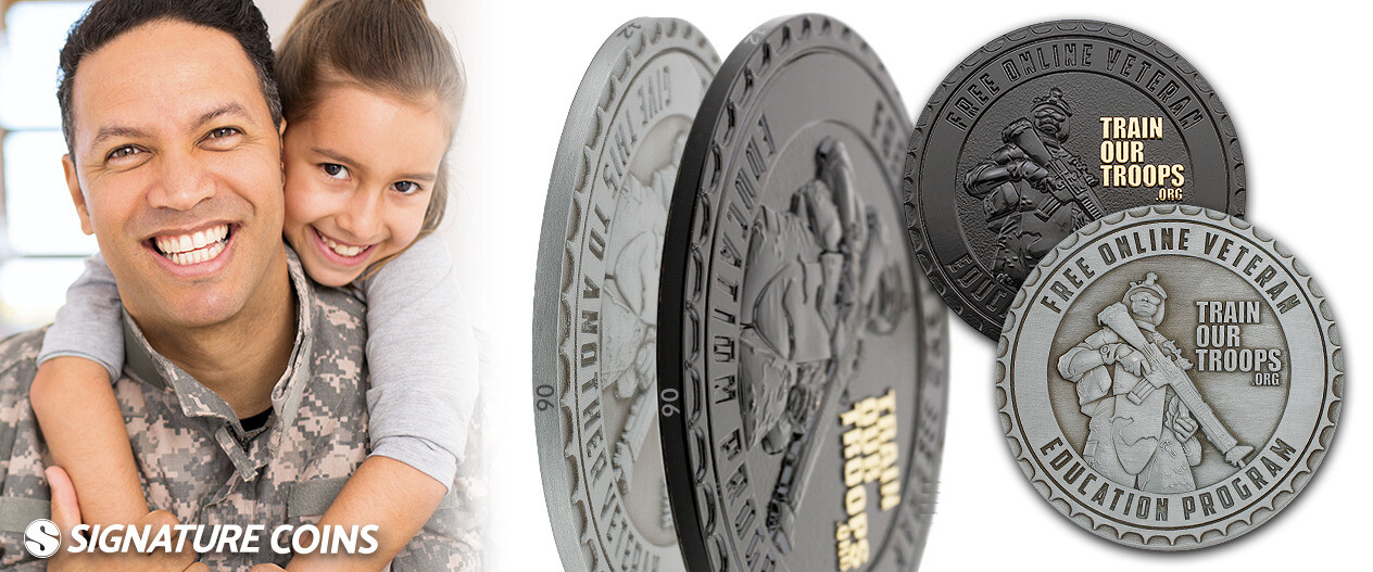 Train Our Troops is another charitable organization that creates trackable challenge coins for a similar program. The numbers around the edge of these coins are used to register the coin on the Train Our Troops website. Once that is done, you give the coin to another veteran and ask them to share it with someone else they think could benefit from the free courses available on the website. Over time, more and more people interact with the coin, and you receive email updates on where the coin has been and where it’s going.