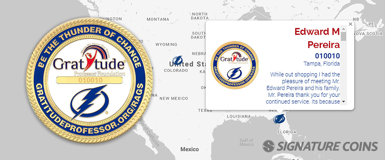If you are not into geocaching, there are still ways to create trackable coins. Our team had the opportunity to help the Gratitude Professor and the Tampa Bay Lighting Foundation create a unique coin used in a special pay it forward program of their own. The idea is to award a coin to a friend, family member or even a stranger with a personal message of gratitude, and to challenge that person to pay it forward, awarding the coin to someone else.