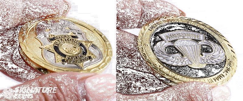 There are all kinds of different ways to add color to a challenge coin design. The entire spectrum of Pantone colors are at your disposal when choosing a standard enamel, and we also have variations of translucent and glitter enamels that can add a little sparkle to your artwork. Metallic enamel comes in silver, copper and a few variations of gold, and the unique effect it creates is an excellent substitute for dual plating.