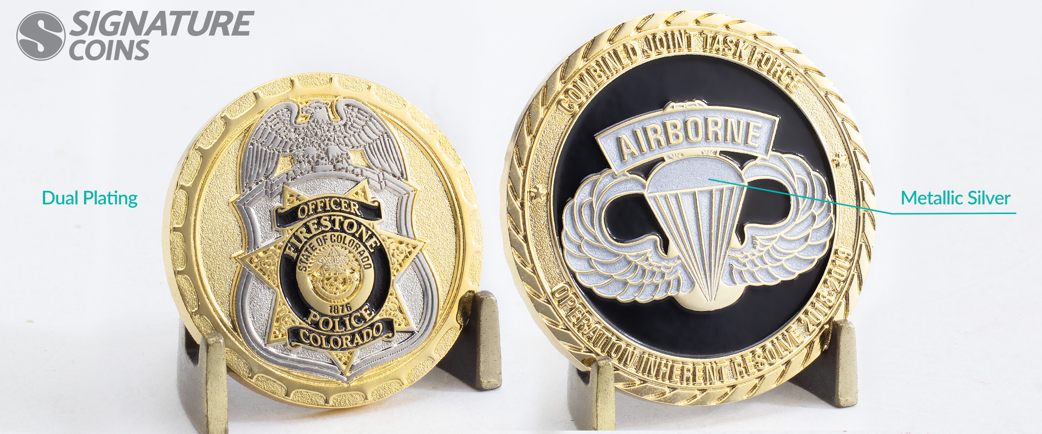 Some other instances where metallic enamel is better suited for a design than dual plating are when you have a colored metal (powder coated) coin or when you’re hoping to add high polish metal to an antique metal coin. The method for creating colored metal coins makes it difficult to dual plate any other type of metal into the design. As for antique metals, they pair well with other antique metals, but if you want a high polish metal shimmer on an antique design, metallic enamel is the only way to go.