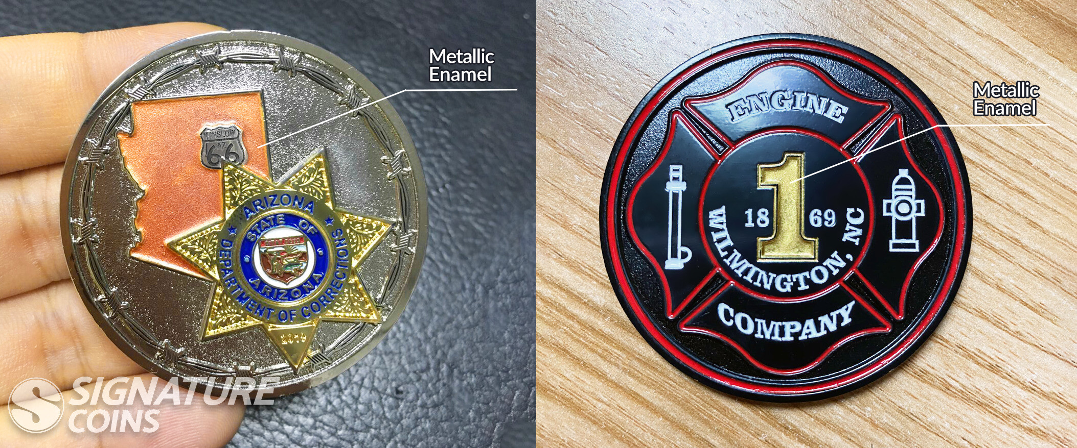 Metallic enamel only costs an additional $0.20 per side. If you’re looking for ways to keep the cost of coins down, metallic enamel will give you a unique effect at a great price.