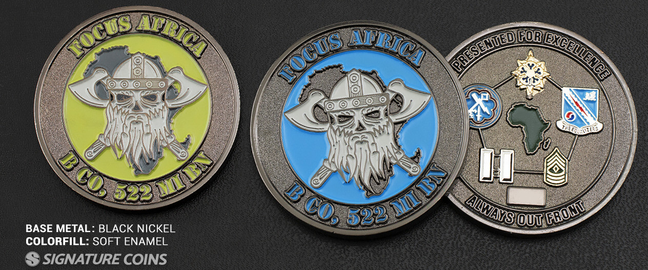 This black nickel challenge coin cuts a striking figure on its own. The bearded skull-like face combines with the helmet and the crossed axes to make a very intimidating image. But part of the fun of this coin in particular is that we worked hard to get the coin made with a few different colorfill options. The different color combinations almost make it look like a new coin each time.