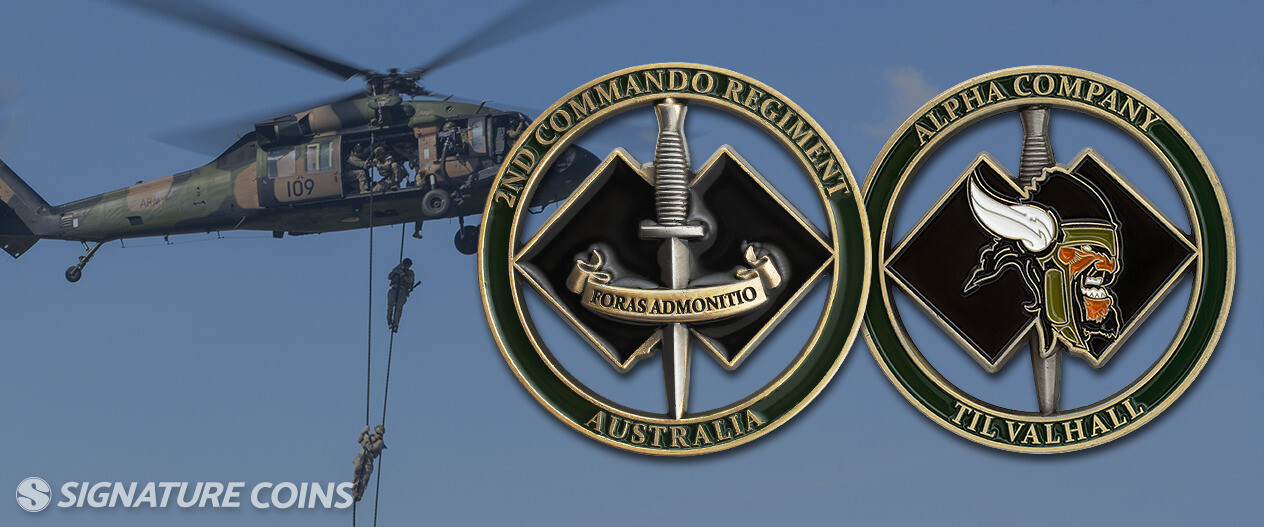 If you think the American Armed Forces are the only ones capitalizing on these historic images for their coins, think again. This coin from the 2nd Commando Regiment of the Aussie Army features a fierce Viking on the front face and an interesting 3D molded dagger. The cutouts really make the coin unique, allowing the primary elements to stand out all the better.