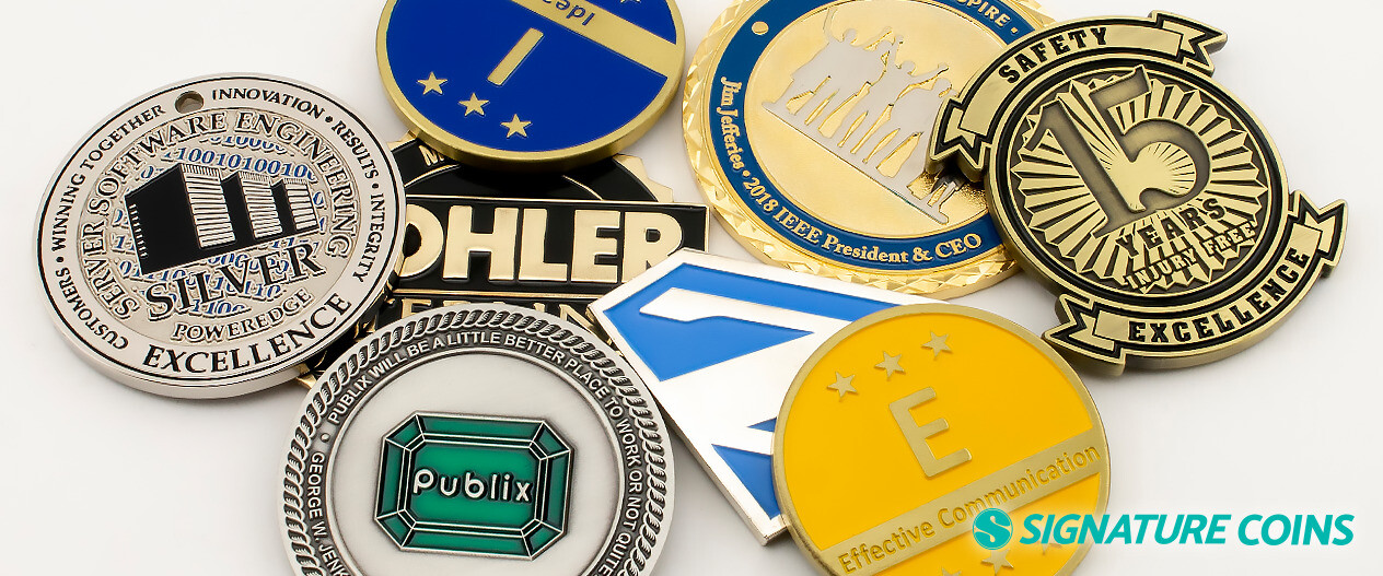 All of our challenge coins are made from durable metals like steel and brass. They resist scratching and denting and are unaffected by things like water or sun exposure, giving them a long-lasting value. Business cards bend, fade and get stained but challenge coins maintain their smooth edges and vibrant colors. When creating a series of challenge coins, designs have lasting value as well. A challenge coins series is a set of different coins designed around the same theme. One side is usually identical across the series.