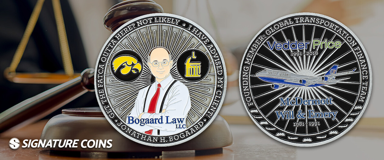 We created this coin for Jonathan Bogaard, the founder of Bogaard Law, LLC. The coin is made from antique silver plating with black colorfill to add contrast in the design. The fine detailing of the company logos, airliner and 2D representation of the man himself catch the eye right away.