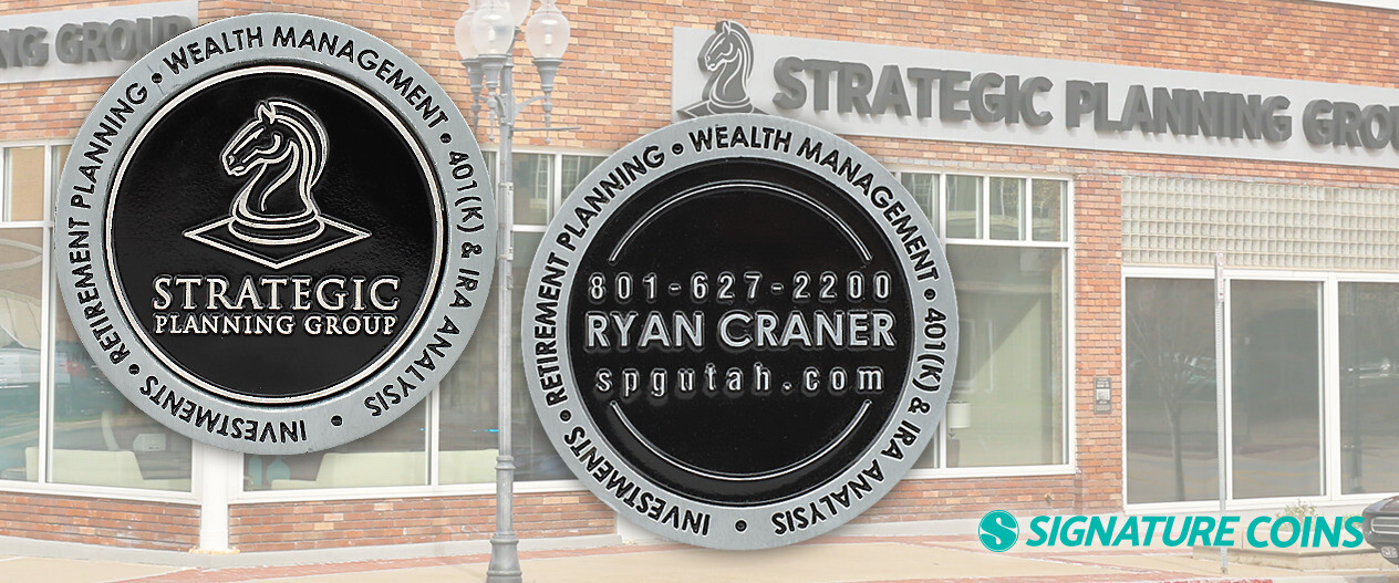 The Strategic Planning Group makes their business card challenge coins with magnetic inserts in them. The smaller insert of the coin is what holds the employee name, contact information and company logo. Since this is everything you would expect on a business card, employees only need to hand out the centerpiece, instead of giving out the whole coin. The base of the coin is used as a coin holder, while the magnetic inserts are used as the business card coin. Not only does this make reorders easier since the smaller magnetic portion of the coin is the only thing that needs to be replenished, but it also creates a coin that’s both functional and well designed.