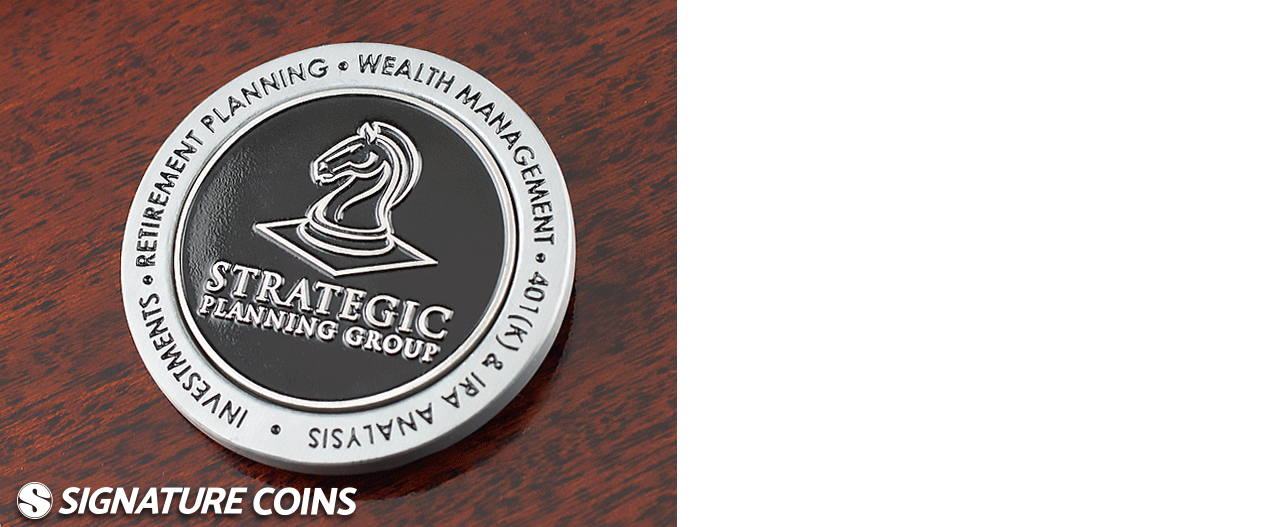 The value of a series design comes in the form of saving money on mold fees when reordering and saving time during production when creating new versions of the coin. The Strategic Planning Group makes business card challenge coins this way to get the most out of their custom design. Each coin is altered to incorporate different names and contact information, but they all share a uniform quality.