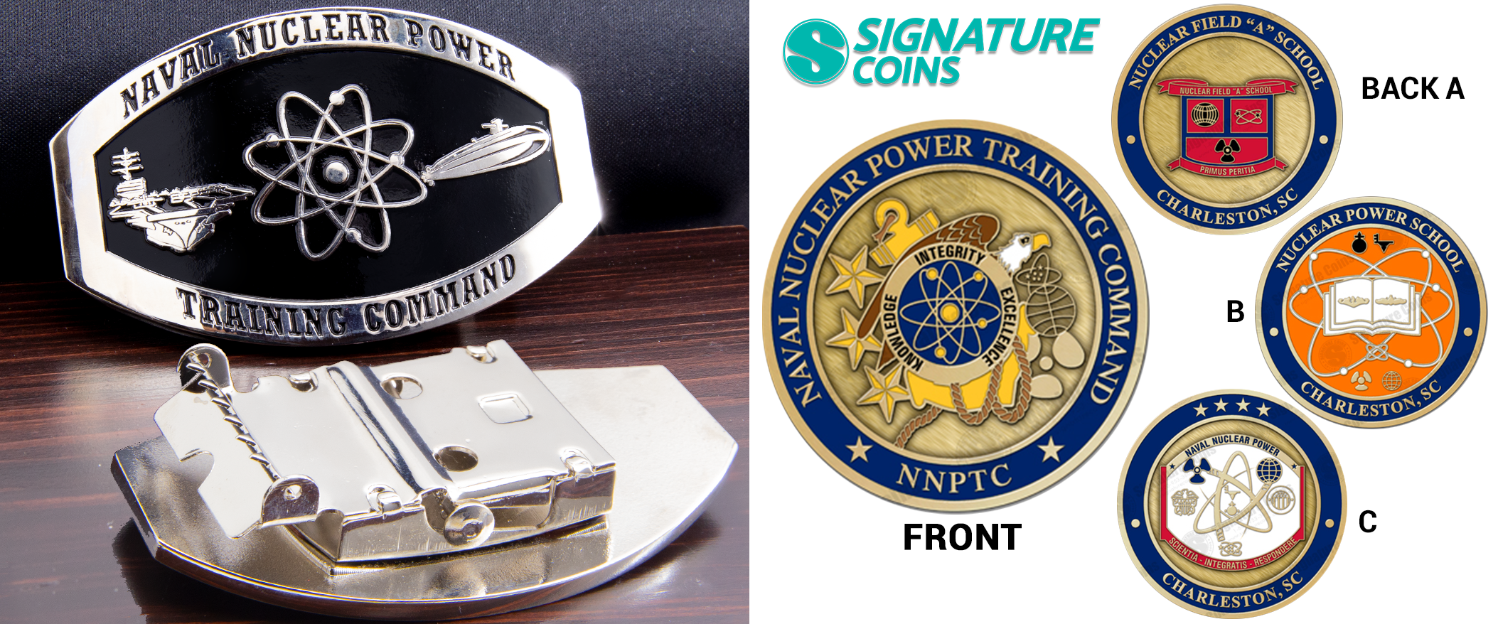 The Naval Nuclear Power Training Command (NNPTC) is a long-time customer of ours. Over the years, they’ve designed unique challenge coins and belt buckles to be delivered to their students. In their most recent order, they selected a series of challenge coins along with their custom belt buckle design.  Each of these products have been ordered by the NNPTC individually before, but this is the first time they’ve kitted the items together in the same order.