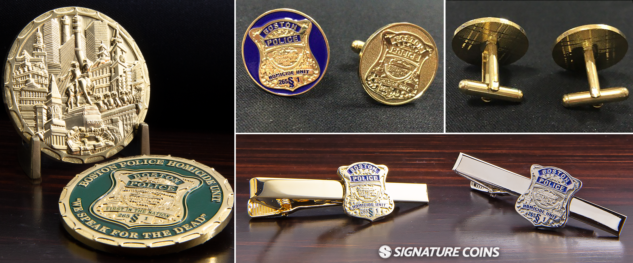 The Boston Police Homicide Unit aren’t strangers to kitting different Signature Coins products together in a single order. In addition to their unique challenge coin series, they also used the design of their police badges to create different cufflinks and tie clips. The Boston Homicide Unit is a good example of how to group our products around a central theme. All of the products they ordered in addition to their challenge coins are uniform accessories to keep their officers looking classy while also increasing team unity. But upgrading your team’s uniform isn’t the only reason to kit different products together.